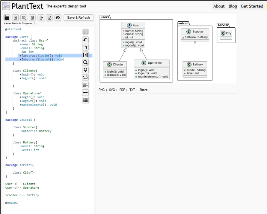Per la rappresentazione grafica abbiamo utilizzato PlantUML, uno strumento ideale per creare diagrammi chiari e strutturati.